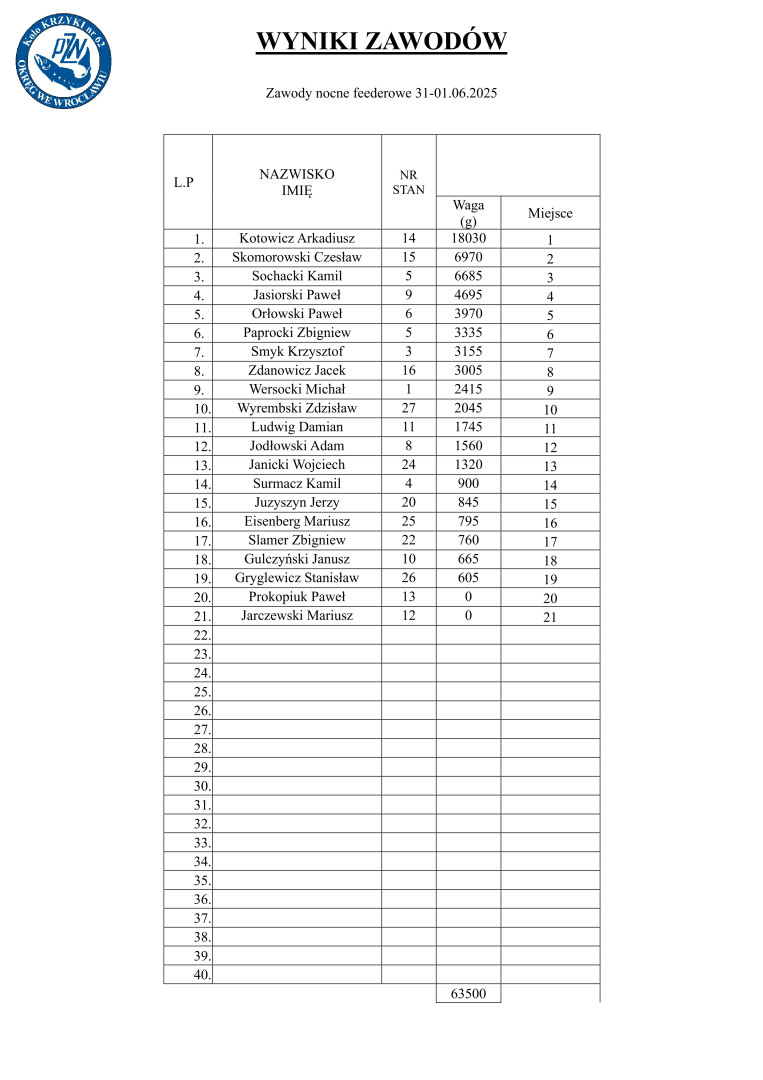 Zawody Feederowe Nocne "Rędzin"